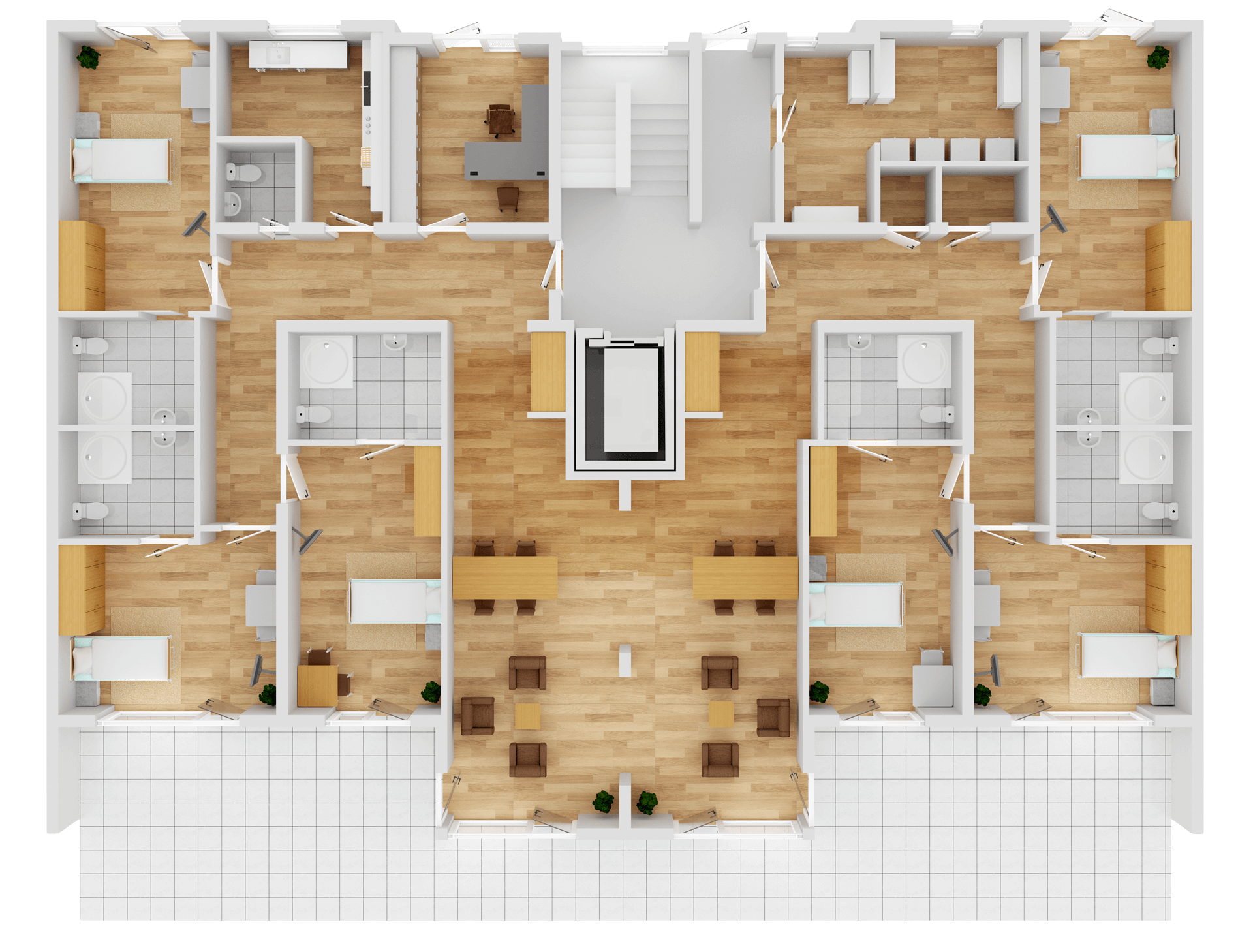 Zwei helle Wohngemeinschaften mit jeweils sechs Zimmern bieten viel Raum für Begegnung und Rückzug. Große Fenster öffnen den Blick ins Grüne und lassen Licht und Leichtigkeit ins Haus. Auf den nach Südwesten gelegenen Balkonen und Terrassen lädt die Sonne zum Verweilen ein – ein Platz, um durchzuatmen, anzukommen und ganz zuhause zu sein.